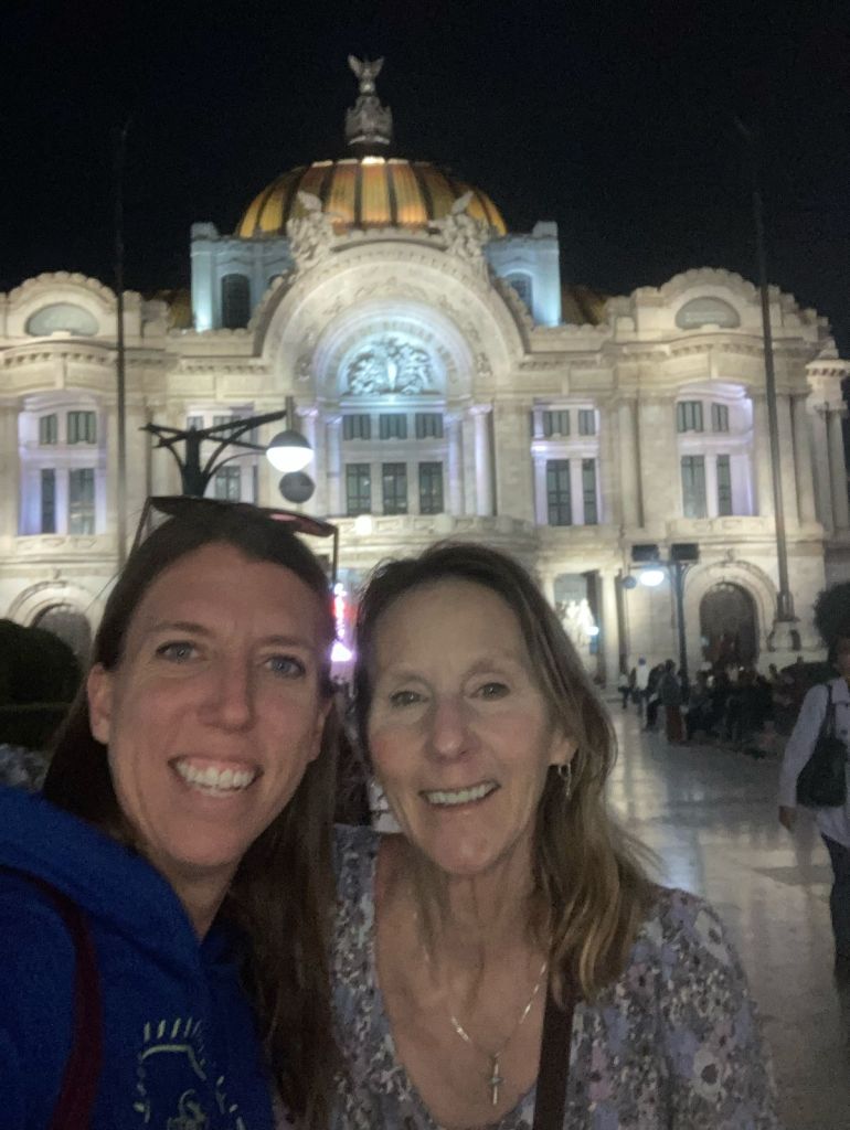 We are in front of the Bellas Artes Museum. The city is lively at night, with people in the parks and restaurants, and a constant hum of traffic.